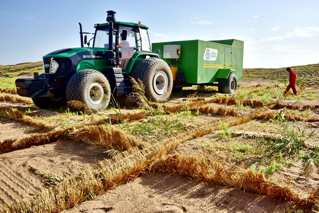 “三北”工程治理沙化土地面积超过3000万公顷。图为甘肃省武威市的治沙基地进行“草方格压沙”作业。摄影/章轲