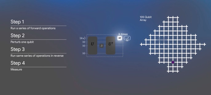 这种新算法的运作方式类似一种高度先进的回声。通过向量子系统(Willow芯片上的量子比特)发送精心设计的信号,扰动其中一个量子比特,随后精确逆转信号的演化过程,以“聆听”返回的“声音”。这种量子“回声”的特别之处在于,它会通过相长干涉得到放大——这是一种量子波叠加后强度增强的现象,这使得测量具备极高的灵敏度。