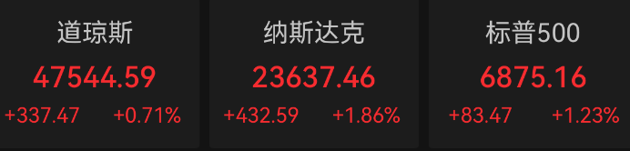 美股主要股指于周一创下历史新高。截至收盘,道指涨337.47点,涨幅为0.71%,报47544.59点,纳指涨1.86%,报23637.46点,标普500指数涨1.23%,报6875.16点,首次收盘站上6800点。