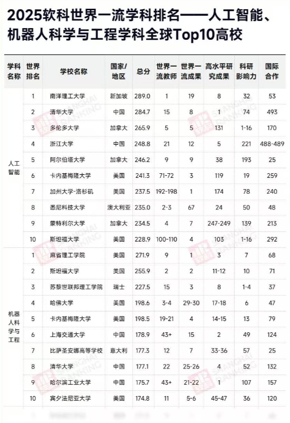 软科今年新增的人工智能学科排名显示,全球共有400所高校上榜,其中,南洋理工大学、清华大学、多伦多大学位列前三;清华大学、浙江大学、哈尔滨工业大学位居国内前三,北京大学、西北工业大学、华中科技大学、南方科技大学、上海交通大学、北京航空航天大学、西安交通大学位列前十。