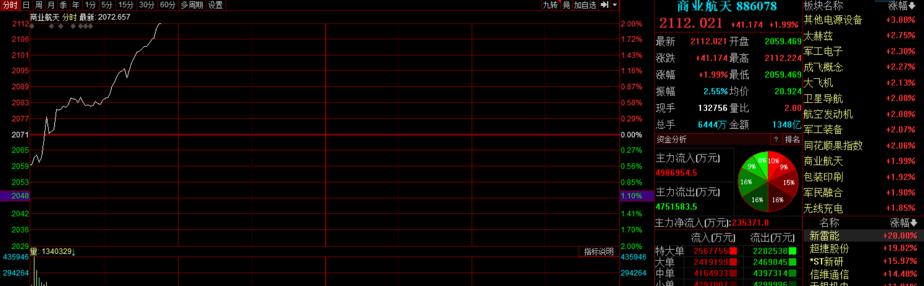 2025-12-24 09:32:0310:20 商业航天概念盘中持续拉升,中超控股、直线涨停,此前神剑股份5连板,新雷能、隆基机械、再升科技等多股涨停,超捷股份、天银机电、信维通信均涨超10%。