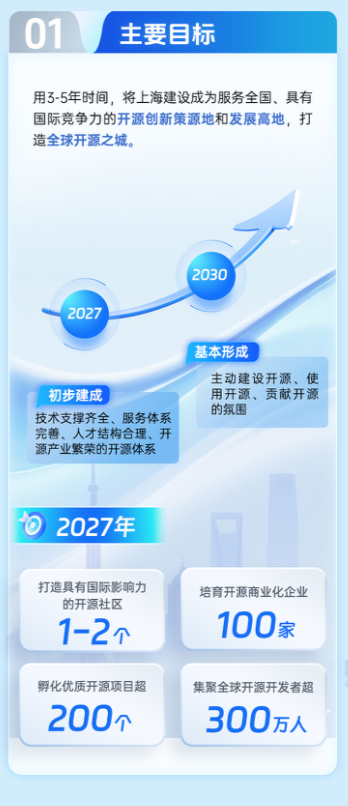25日,上海公布了《上海市加强开源体系建设实施方案》(下称“方案”),提出通过3至5年努力,打造1~2个具有国际影响力的开源社区,孵化200个以上优质开源项目,集聚超300万全球开发者,初步建成技术支撑齐全、服务体系完善、人才结构合理、开源产业繁荣的开源体系。