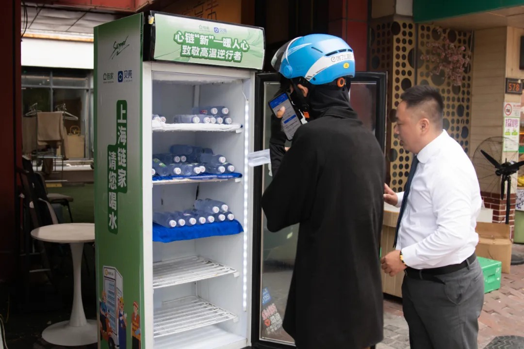 不久后,肖流便自费购置了一台冰柜放置在门店门口,冰柜上贴着“户外工作者可免费取用”的醒目标识,里面整齐地摆放着冰镇矿泉水,每一瓶水上都细心贴着“上海链家请您喝水”的标签。