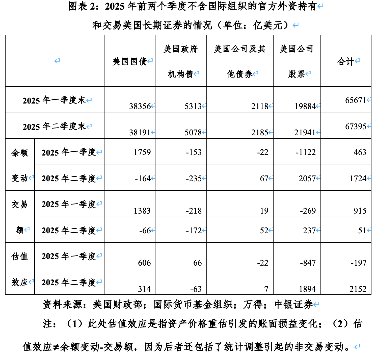 TIC报告显示,美国公司股票是不含国际组织的官方外资持有的第二大美元储备资产,占比三成多(美债占比不到六成)。美股涨跌从资产价格重估的角度对全球美元储备的估值影响不容低估。不含国际组织的官方外资持有四大类美国长期证券资产,一季度合计录得估值损失197亿美元,二季度录得估值收益2152亿美元(约为一、二季度末官方外资平均持有美国长期证券资产余额的3.2%)。其中,一季度持有美股录得估值损失847亿美元,二季度录得估值收益1894亿美元,显然是前述估值扰动的主要来源。