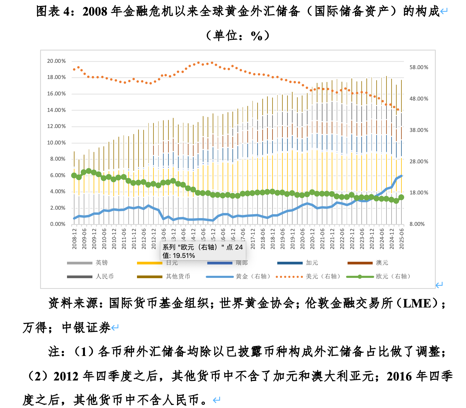 文中指出,今年上半年美元指数下跌超过10%,创下1973年以来的最大跌幅。如果保持汇率不变,第二季度,美元储备份额仅略有下降至57.67%,回落0.13个百分点。文中还特别指明第二季度的最大赢家欧元有点“胜之不武”。原始数据显示,当季,欧元储备份额从3个月前的20%升至21.13%,上升了1.13个百分点,但欧元当季对美元升值9%,汇率的正估值效应贡献了1.17个百分点。如果汇率保持稳定,欧元储备份额将下降0.04个百分点至19.96%。在这里,汇率的估值效应有效地掩盖了该货币储备份额的变化方向。