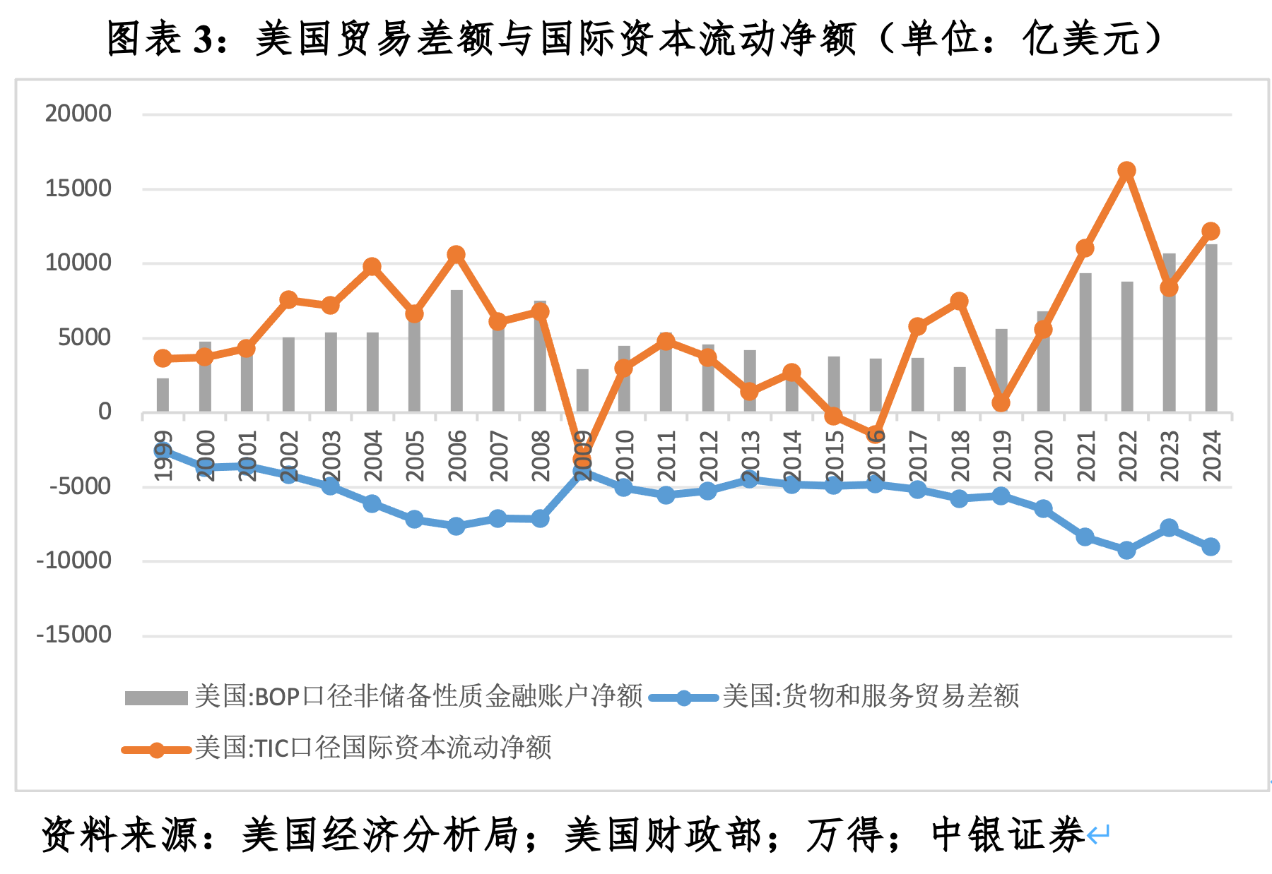 2005~2024年,美国TIC口径的国际资本流动净额与贸易差额为此消彼长的强负相关0.918。今年前7个月,该口径的国际资本净流入7882亿美元,同比增长1.42倍,与同期贸易逆差6542亿美元,同比扩张30.9%也互为镜像。过去20年来,仅有2009、2015和2016年3年,TIC口径的美国国际资本流动出现年度负值,分别净流出3163亿、231亿和1481亿美元。但TIC口径的国际资本流动主要反映跨境证券投资,同期包括跨境直接投资和其他投资在内的美国全口径外资(即BOP口径的非储备性质金融账户净额)依然为正值,分别净流入2916亿、3801亿和3645亿美元。