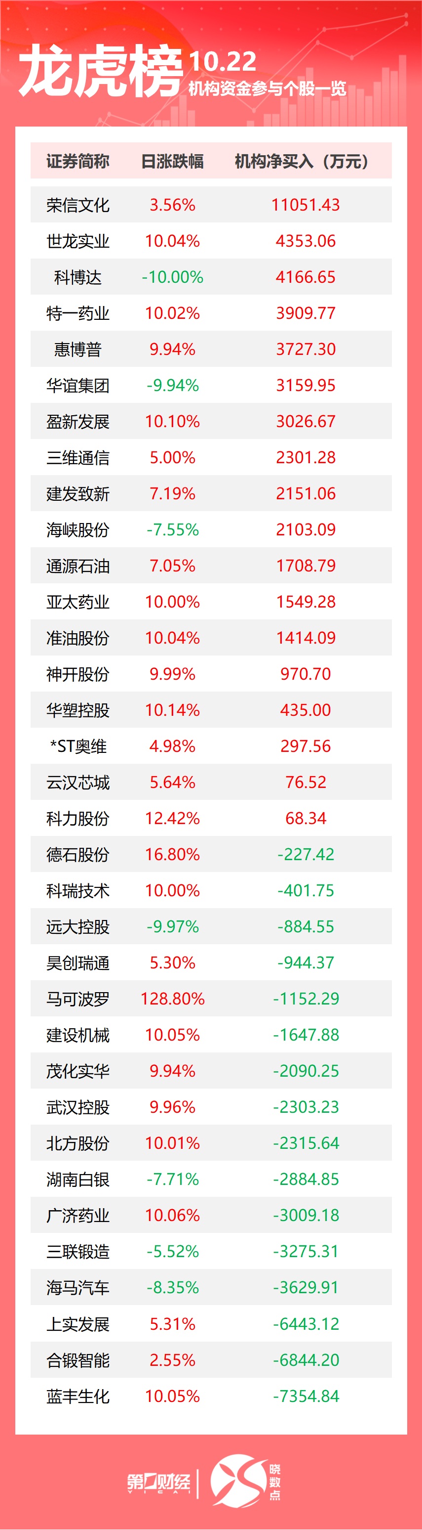 10月22日龙虎榜中,共34只个股出现了机构的身影,18只股票呈现机构净买入,16只股票呈现机构净卖出。当天机构净买入前三的股票分别是荣信文化、世龙实业、科博达;当天机构净卖出前三的股票分别是蓝丰生化、合锻智能、上实发展。