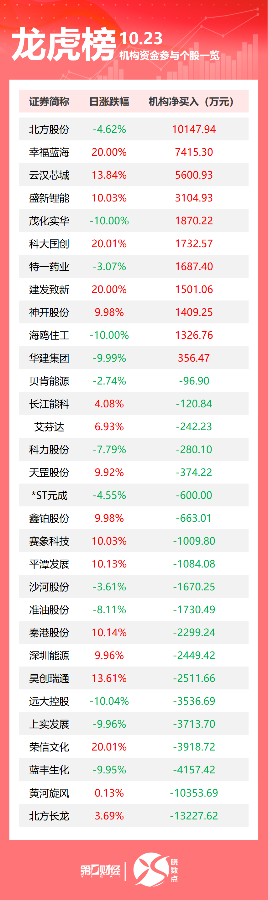 机构23日买入这11股,抛售北方长龙1.32亿元