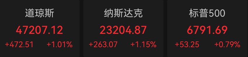 美国股市上周五显著上扬,道琼斯工业平均指数上涨472.51点,收于47207.12点,涨幅1.01%;标普500指数上涨0.79%,收于6791.69点;纳斯达克指数上涨1.15%,收于23204.87点,三大指数均创下收盘历史新高。
