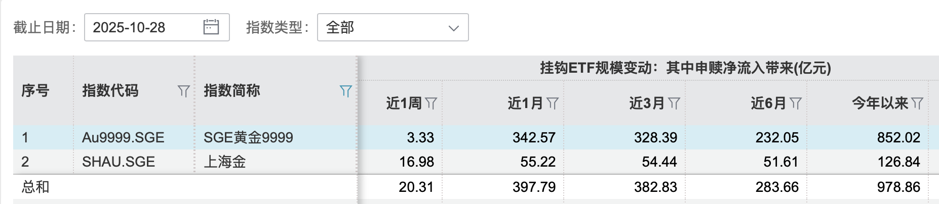 据Wind统计,10月20日至28日,14只挂钩实物金的黄金ETF均实现了份额增长,总计增长8.65亿份,且近一周由申赎净流入带来的规模变化超20亿元,近一个月更是增长约398亿元。