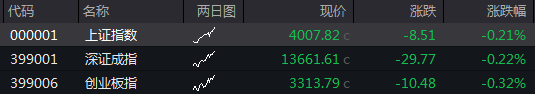 沪指低开0.21%,深成指低开0.22%,创业板指低开0.32%。