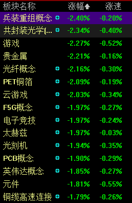 09:50 指数走弱,创业板指下挫跌逾1%,沪指跌0.15%,深成指跌0.65%。军工、贵金属、游戏等方向跌幅居前,市场下跌个股近3800只。