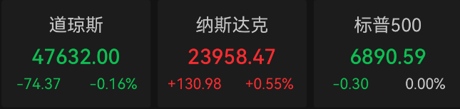 明星科技股分化,谷歌涨2.5%,亚马逊涨0.5%,苹果涨0.2%,特斯拉涨0.2%,Meta平收,微软跌0.1%,甲骨文跌2.0%。