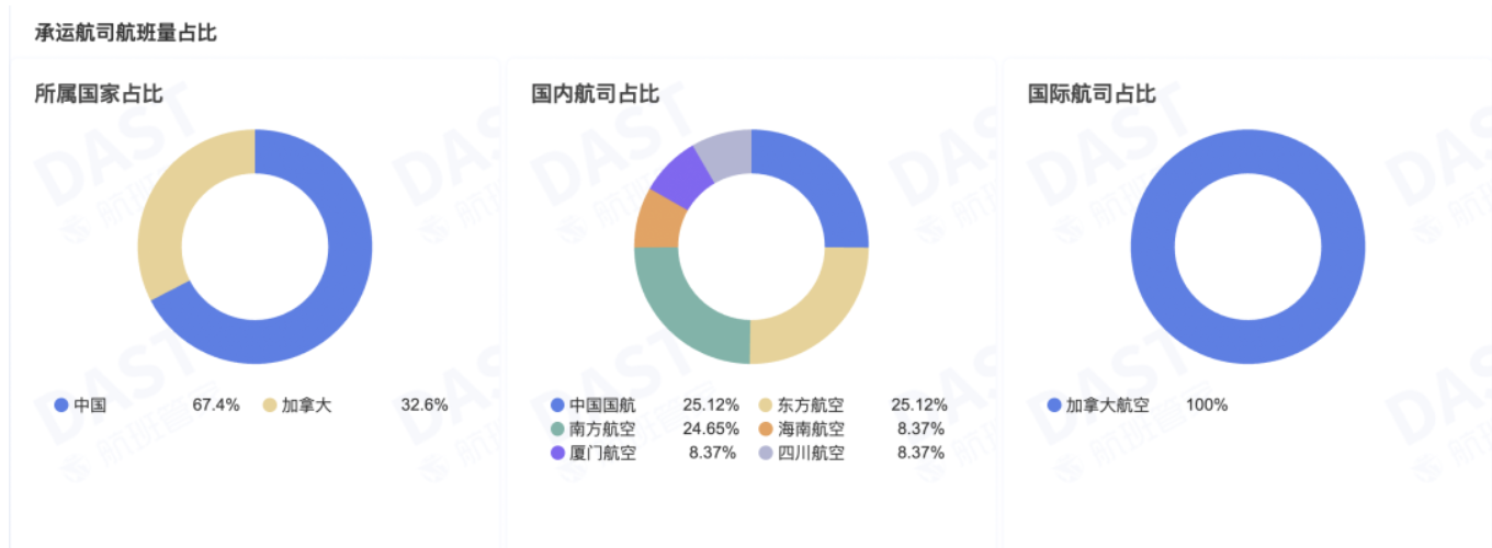 由于中加航线目前仍有中加航司航班量对等的限制,目前国内航司航班量份额更大意味着,加拿大航空尚未完全用满目前已经批复的航权。