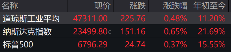 当地时间周三,美股三大股指反弹,截至收盘,道指涨0.48%,纳指涨0.65%,标普500指数涨0.37%。