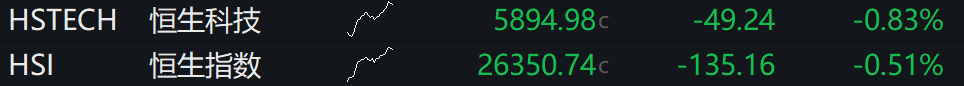 恒生指数低开0.51%,恒生科技指数跌0.83%。半导体、新能源车概念股回调,机器人、电网设备概念股走强。