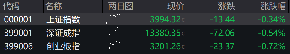 沪指低开0.34%,深成指低开0.54%,创业板指低开0.72%。