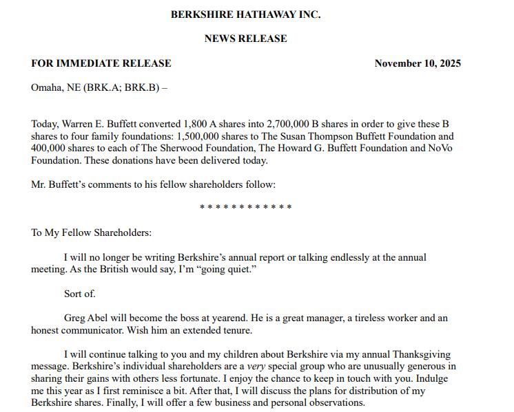 2025-11-11 07:25:15当地时间周一,伯克希尔哈撒韦公司在官网发布首席执行官(CEO)巴菲特(Warren Buffett)致股东的年度信,“奥马哈传奇”在信中表示将在今年年底卸任后 “减少公开活动”。虽然很可能是其作为伯克希尔CEO的最后一份声明,这位95岁的老人目前暂不打算彻底退出公众视野。