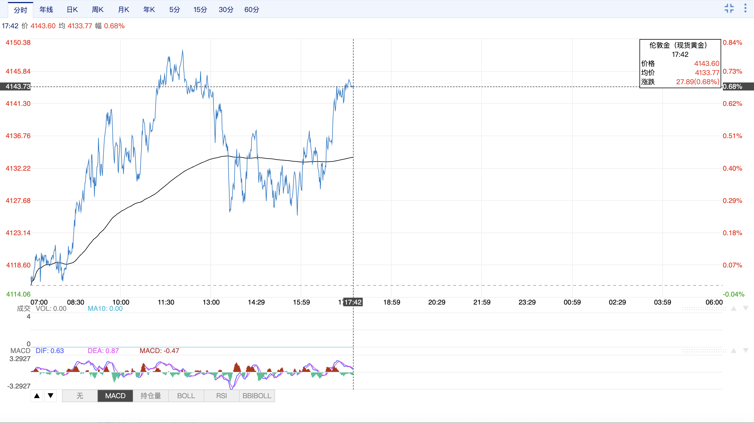 11月11日,国际金价大涨,日内开盘价为4116.20美元/盎司,盘中冲高至4148.91美元/盎司,随后回落,11日17:30时的价格在4143美元/盎司,较昨日4115美元/盎司的收盘价,上涨约为28美元/盎司。10月下旬的国际金价走势以下跌为主,在11月连涨几日后,11日17:30时的报价较10月20日现货黄金价格4381.29美元/盎司的高位仍有明显回落。
