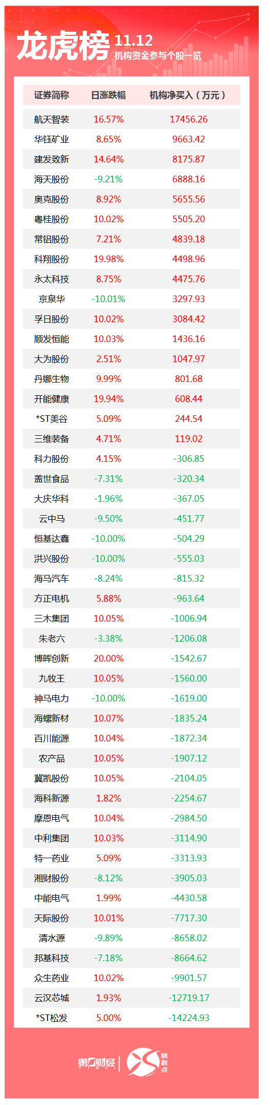 11月12日龙虎榜中,共46只个股出现了机构的身影,有17只股票呈现机构净买入,29只股票呈现机构净卖出。当天机构净买入前三的股票分别是航天智装、华钰矿业、建发致新。当天机构净卖出前三的股票分别是*ST松发、云汉芯城、众生药业。
