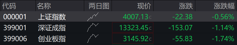 沪指低开0.56%,深成指低开1.14%,创业板指低开1.74%。