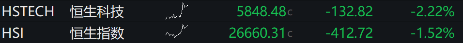 恒生指数低开1.52%,恒生科技指数跌2.22%,百度集团跌超7%领跌蓝筹,腾讯控股、京东集团绩后分别跌约2%、3%。存储概念股普跌,华虹半导体跌近4%。