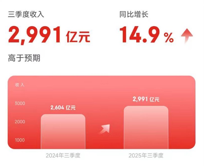 三季度,京东集团收入为2991亿元人民币(约420亿美元),同比增长14.9%,超出预期。
