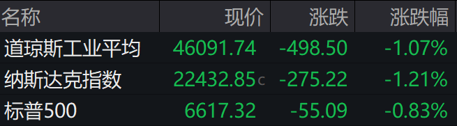 当地时间周二,美国股市继续下行,道指、标普500指数连续第四个交易日下跌。截至收盘,道指跌1.07%,标普500指数跌0.83%,纳指跌1.21%。