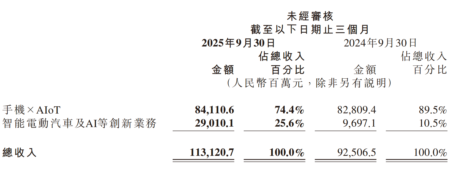 业务分部方面,该季度小米集团手机×AIoT分部收入841.1亿元,同比增长1.6%,占总营收74.4%;智能电动汽车及AI等创新业务分部收入290.1亿元,同比增长199.2%,占总营收25.6%。