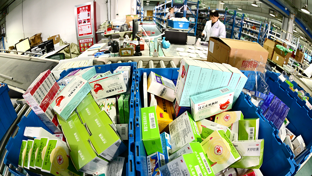 图为某医药电商物流园内,工作人员忙着对药品进行分拣、验单、打包