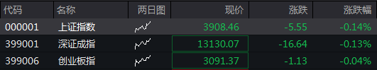 沪指低开0.14%,深成指低开0.13%,创业板指低开0.04%。