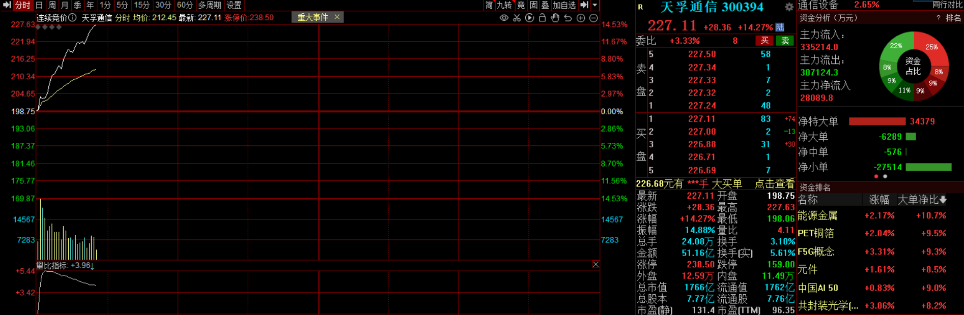 2025-12-08 09:32:5109:55 天孚通信盘中股价创历史新高,现涨超14%,报227.11元,总市值为1766亿元。