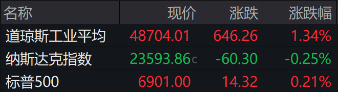 当地时间周四,美股走势分化,道指与标普500指数在周期股带动下续创新高。截至收盘,道指涨1.34%,纳指跌0.25%,标普500指数涨0.21%。