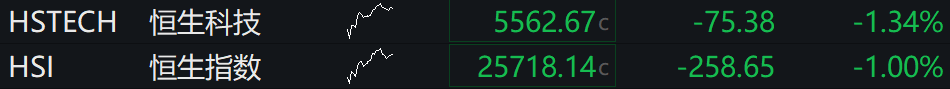 恒生指数低开1%,恒生科技指数跌1.34%。京东健康跌逾5%,百度集团跌逾3%,理想汽车、阿里巴巴跌逾2%。