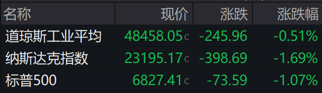 当地时间上周五,美股主要指数全线走低。截至收盘,道指跌0.51%;纳指跌1.69%,创两周新低,标普500指数跌1.07%。