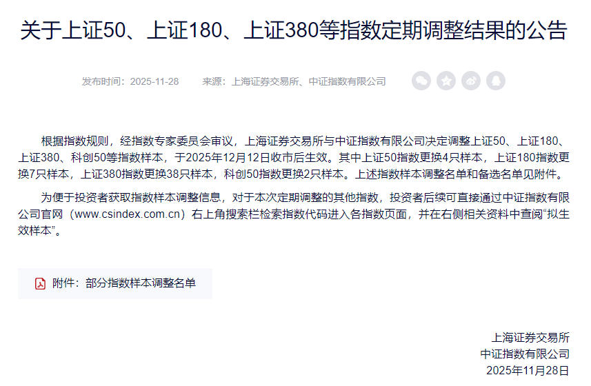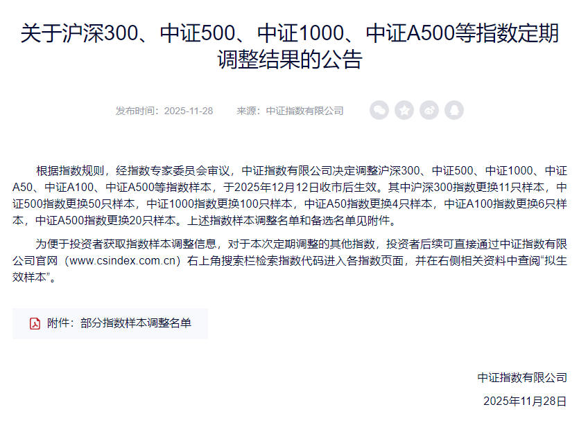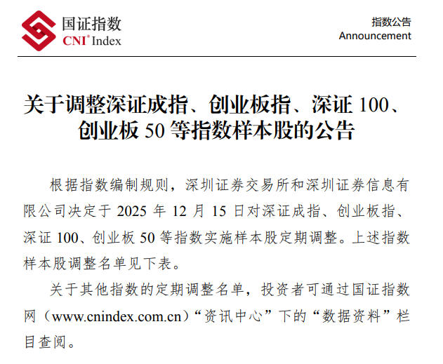 2025-12-15 21:37:3511月末,沪深交易所、中证指数有限公司(下称“中证指数”)、深圳证券信息有限公司(下称“深证信息”)等集中公告,根据指数规则,对A股多个核心指数进行样本股定期调整。
