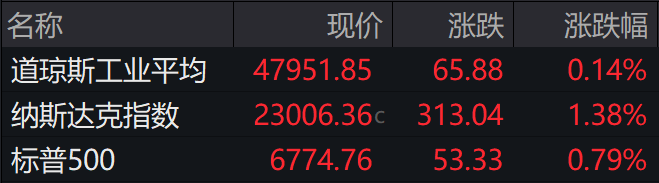 大型科技股普遍走高。特斯拉上涨3.45%,英伟达上涨1.87%,博通上涨1.18%,微软上涨1.65%,Meta上涨2.32%,亚马逊上涨2.48%;AlphabetA股和C股分别上涨1.93%和1.91%,苹果小幅上涨0.13%。