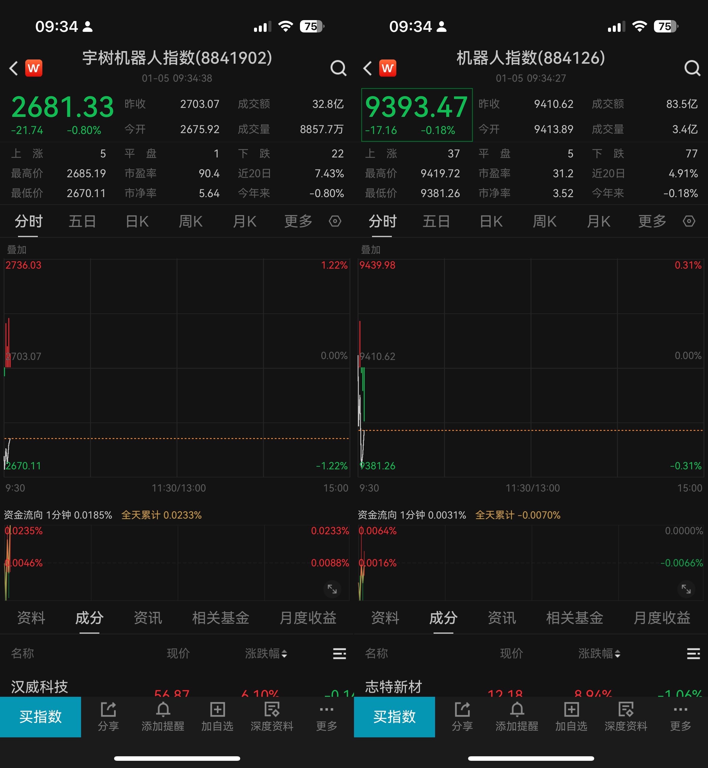 2026-01-05 09:55:171月5日,宇树机器人指数(8841902)机器人指数(884126)盘初震荡调整。截至发稿,宇树机器人指数跌0.8%,机器人指数跌0.18%。