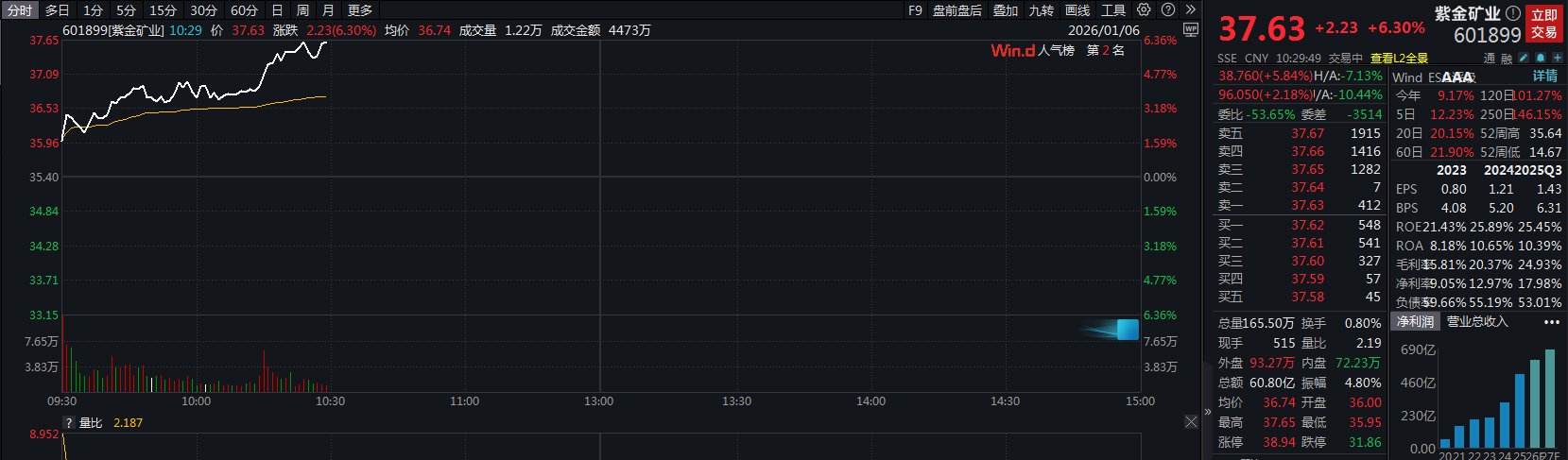 2026-01-06 09:36:3910:30 紫金矿业涨超6%,A股总市值首次突破1万亿元。