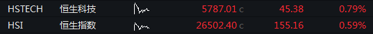 恒生指数高开0.59%,恒生科技指数涨0.79%。科网股多数走强,腾讯音乐、比亚迪股份、百度集团、快手、网易涨幅居前;蔚来、阿里巴巴走低。