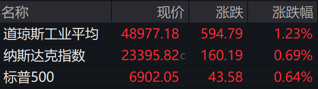 当地时间周一,美股三大股指高开高走,标普500指数收复6900点。截至收盘,道指涨1.23%,盘中首次突破49000点创下历史新高,纳指涨0.69%,标普500指数涨0.64%。