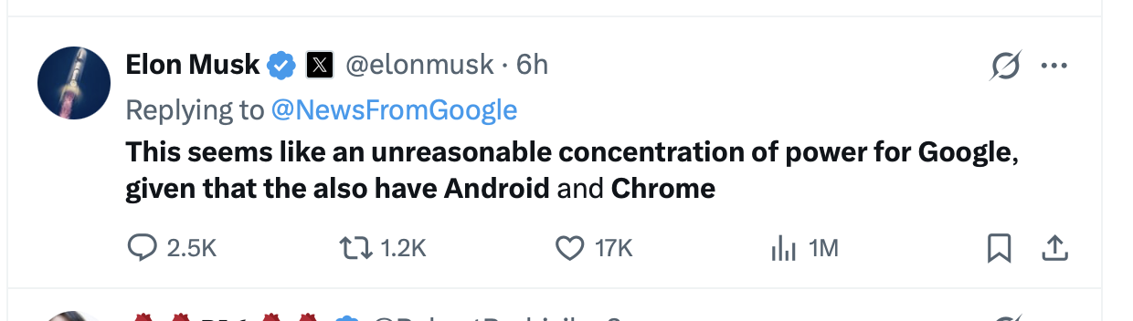 “考虑到谷歌已经控制了Android和Chrome,这样的合作将导致不合理的权力集中。”马斯克在X上写道。