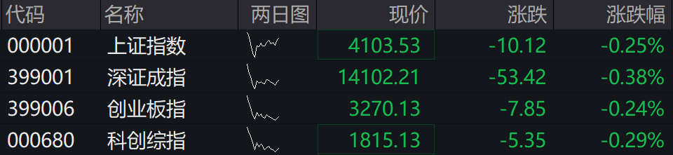 沪指低开0.25%,深成指低开0.38%,创业板指低开0.24%,科创综指低开0.29%。