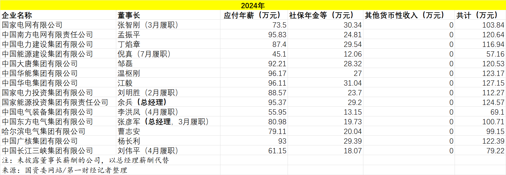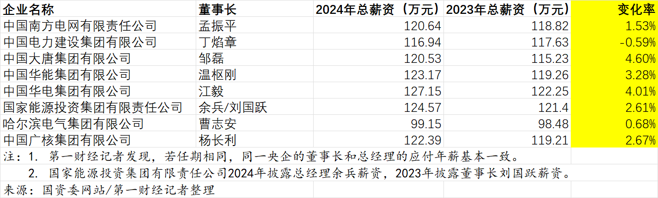 其中,中国大唐集团、中国华电集团和中国华能集团董事长的总薪资涨幅领跑,同比2023年分别上涨4.60%、4.01%和3.28%。