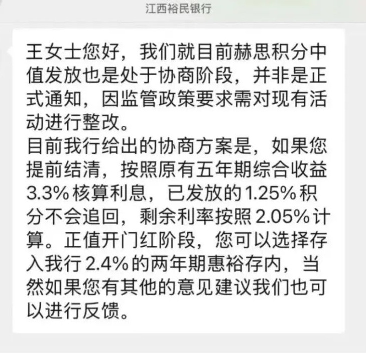 同时,上述微信截图内容也强调:目前该方案处于协商阶段,并非正式通知,如果储户有其他意见建议可以进行反馈,“因监管政策要求需对现有活动进行整改”。